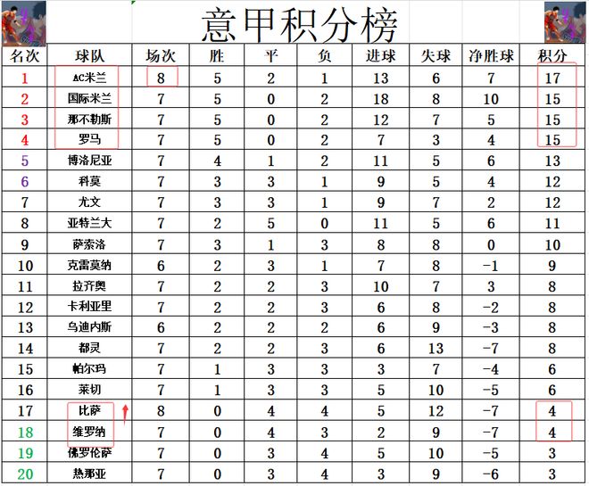 积分榜方面,AC米兰好不容易再次拿到榜首,然而却再和垫底的副班长比赛中爆出大冷,再最后时刻才抢到了1分,这样的话他们暂时领先国米,那不勒斯和罗马2分,还是第1,只不过本轮国米3队只要有1队赢球,AC米兰的榜首就要丢掉。比萨虽然没有拿到3分,但也凭进球优势暂时逃出降级区。
